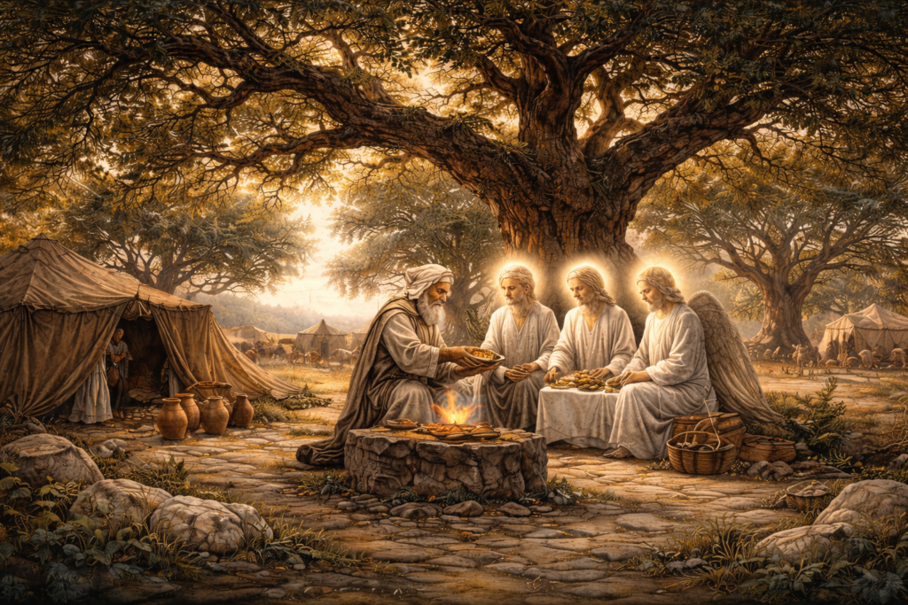 Geneza 18:1 fixează scena: Avraam stă la intrarea cortului „pe la zăduf”. Apar trei oaspeți; Avraam le oferă apă, odihnă și masă.